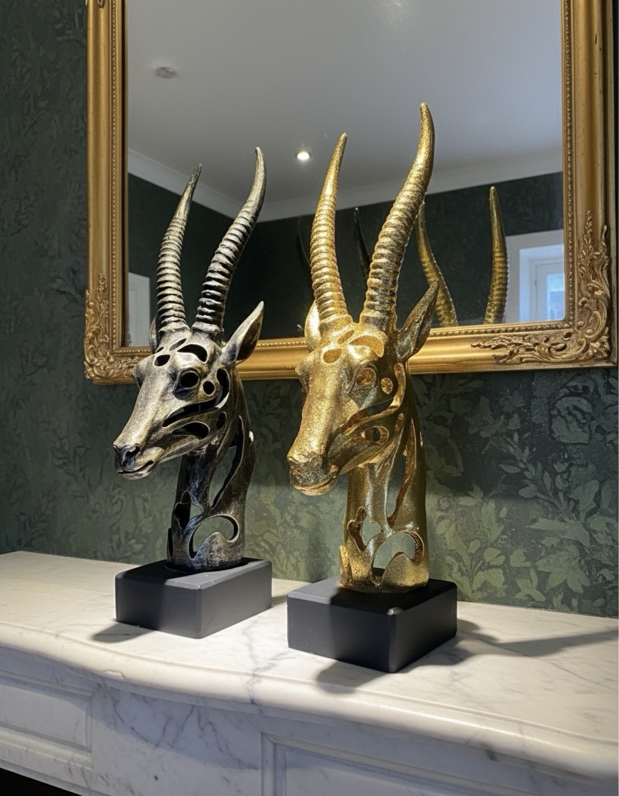 رأس ماعز فخم، بتفاصيل دقيقة وأناقة ملفتة، يجسد القوة والهيبة، ويضيف لمسة من الفخامة والتميز لأي مساحة، ليصبح قطعة ديكور استثنائية تجذب الأنظار فورًا.