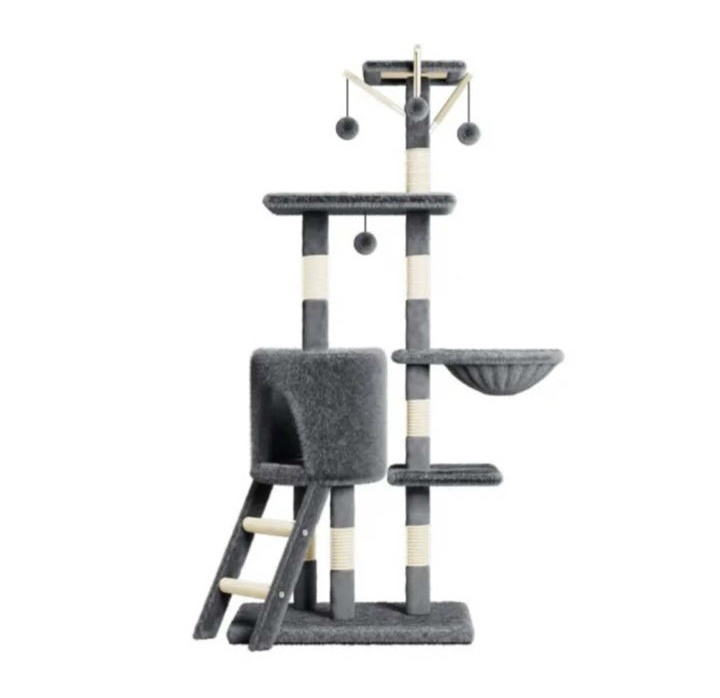 يتميّز هذا البرج الأنيق بتصميمه المتين والمغطّى بأقمشة ناعمة مريحة تضمن للقطّ تجربة لعب واسترخاء مثالية. يحتوي على عدة مستويات، سلّم صغير، بيت مريح، منصة نوم، وألعاب معلّقة تحفّز النشاط والحركة